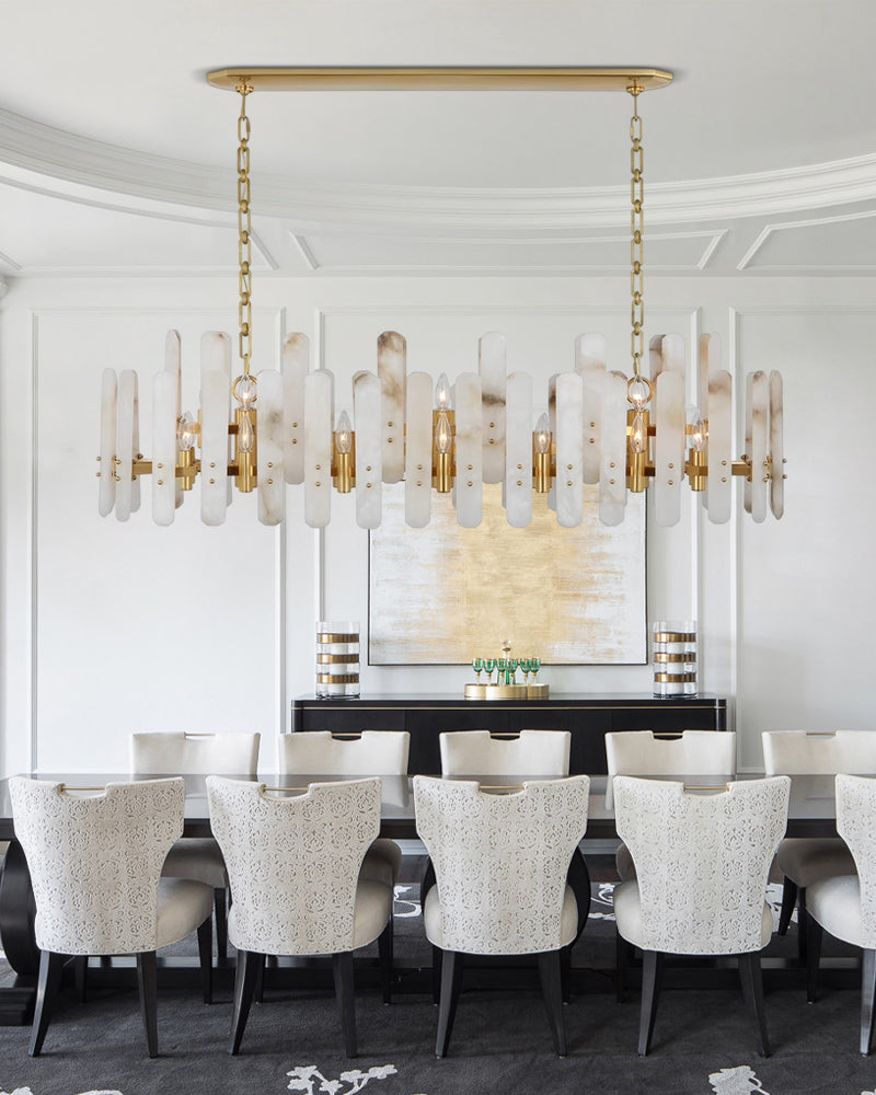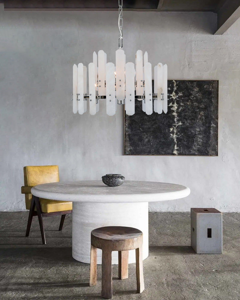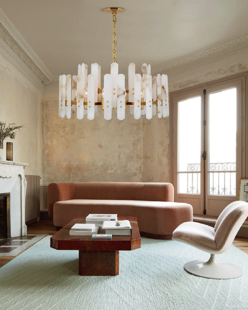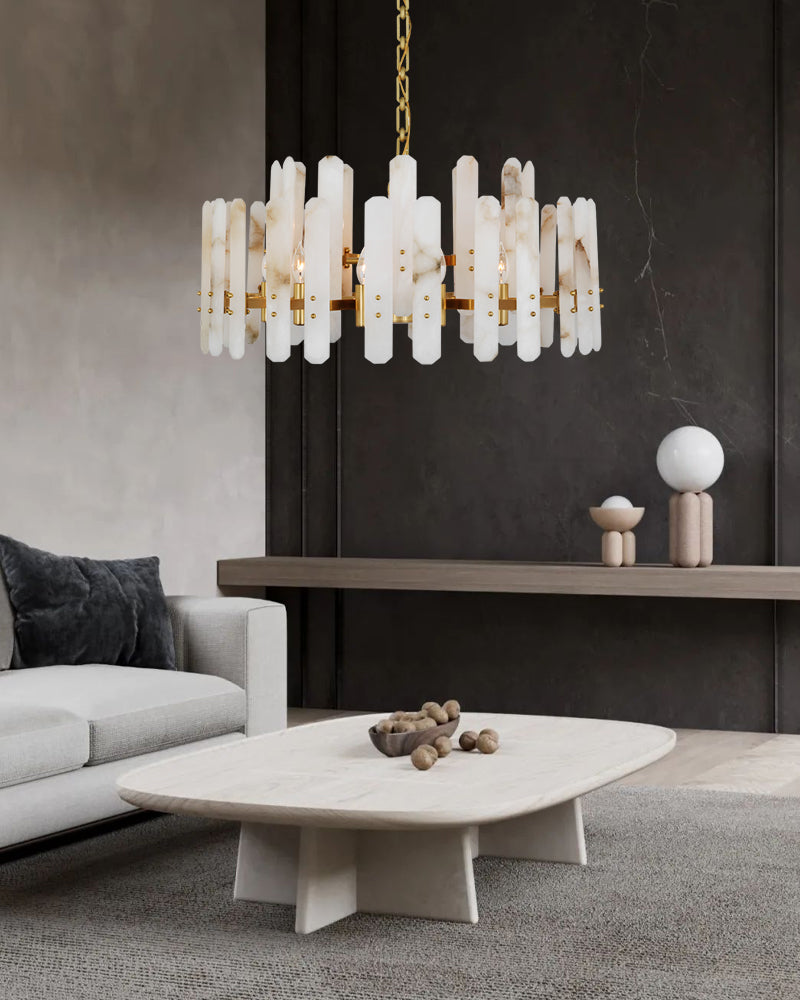 The material of alabaster is marble and copper. Elevate your space with this elegantly crafted chandelier, blending minimalist modern design with timeless sophistication. Perfect for living rooms, dining areas, or entryways, it harmonizes functionality and artistry.