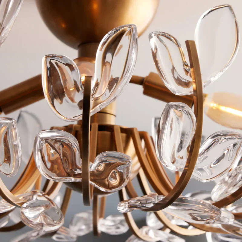 Handcrafted from steel with brass plating, Adela scatters light through its beautiful glass petals. A lovely statement for any living space, softly sculpted petals create an organic feel, while steel branches secure the canopy and provide structure to the piece.