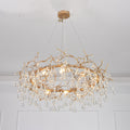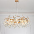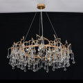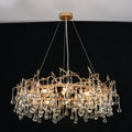 The water drop chandelier is made of brass and glass drops, This artistic lighting fixture features a center area where life-like branches start to twist and turn from, covered with a luxurious brass finish. Multiple light bulbs provide the dramatics of light rays glistening through the crystal droplets.