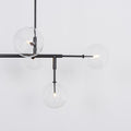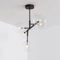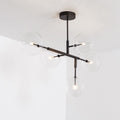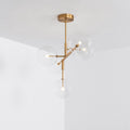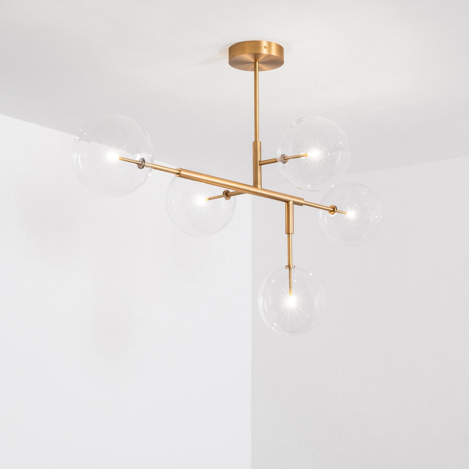 Organic improvisation gives way to chic modern order. Liner brass branches suspend circular globes of light.