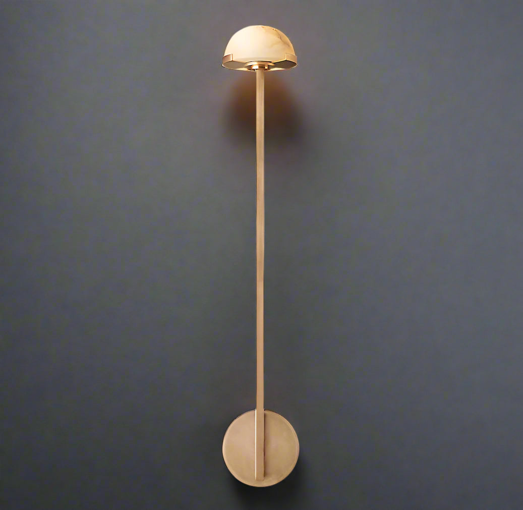 This sophisticated brass wall sconce features a half-dome alabaster shade, offering a warm and ambient glow that adds elegance to any room. With its sleek vertical brass frame and minimalist design, this wall light enhances modern interiors, bringing a touch of refined luxury to bedrooms, hallways, or living spaces. The alabaster dome softens the light, creating a soothing atmosphere perfect for intimate areas.