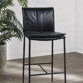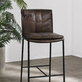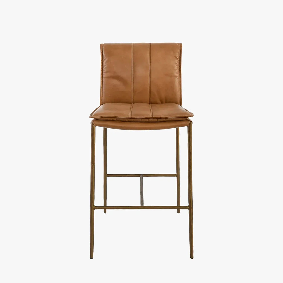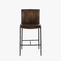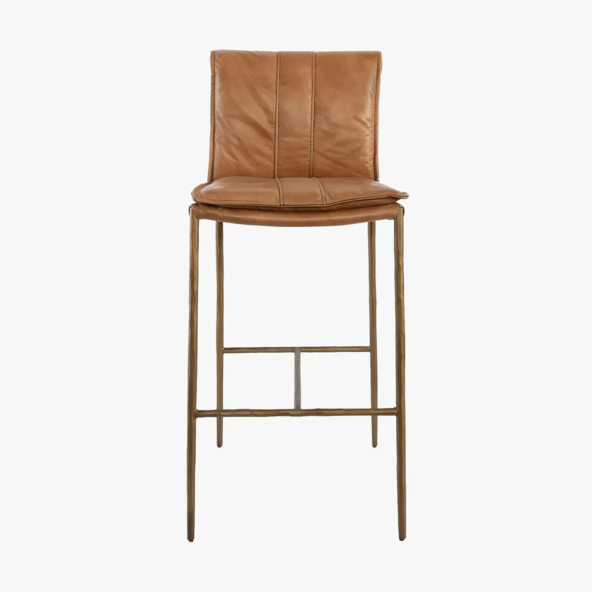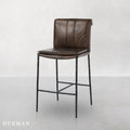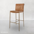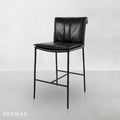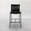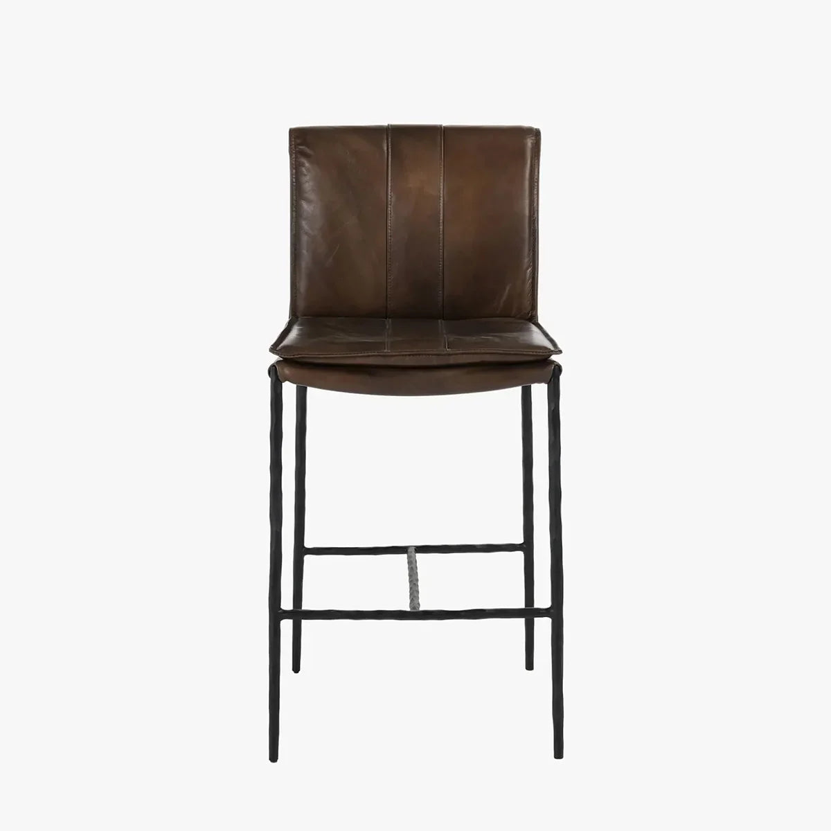 Inspired by '70s lounge furniture, these leather stools feature plush, fold-over back cushions for comfort and style. Hammered iron legs provide an elongated silhouette, perfect for both compact and large spaces. The minimalist, modern design blends seamlessly with various aesthetics.