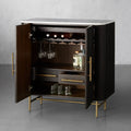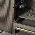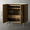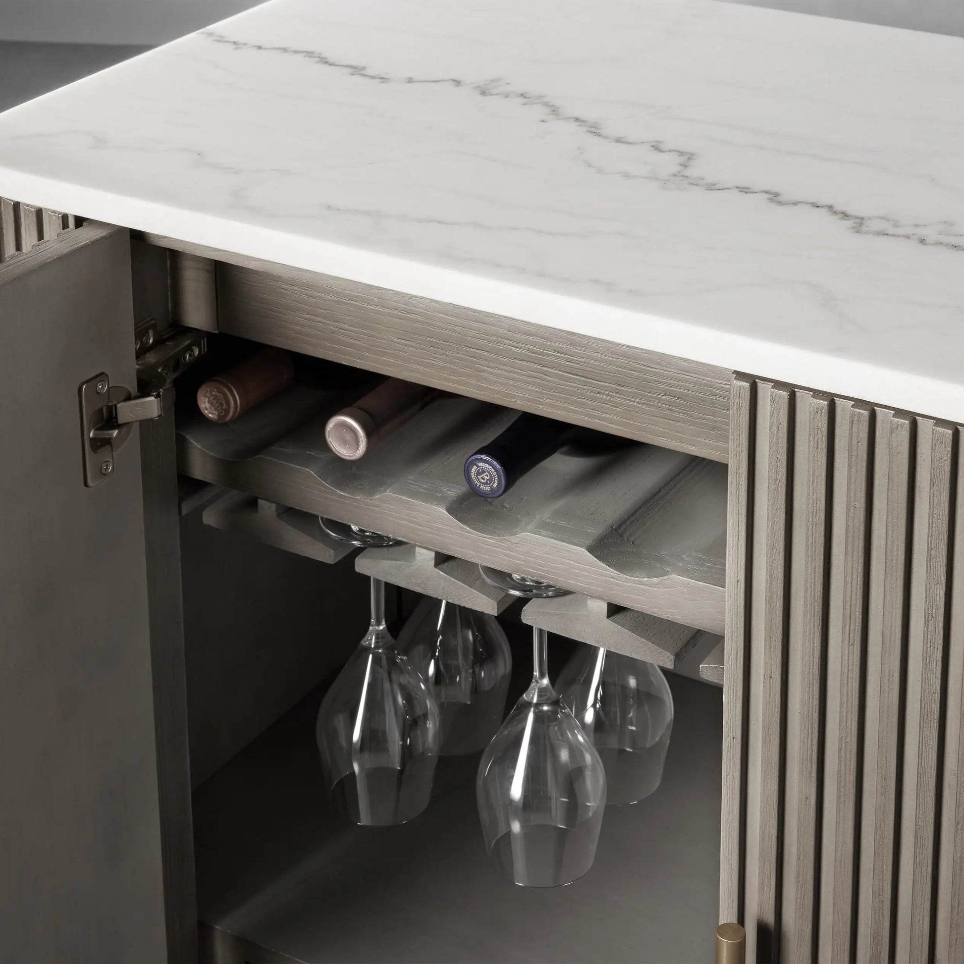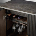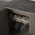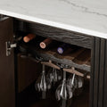 - The bar cabinet includes built-in storage for wine bottles and stemware, along with a shelf and two interior drawers to keep your entertaining essentials neatly organized.