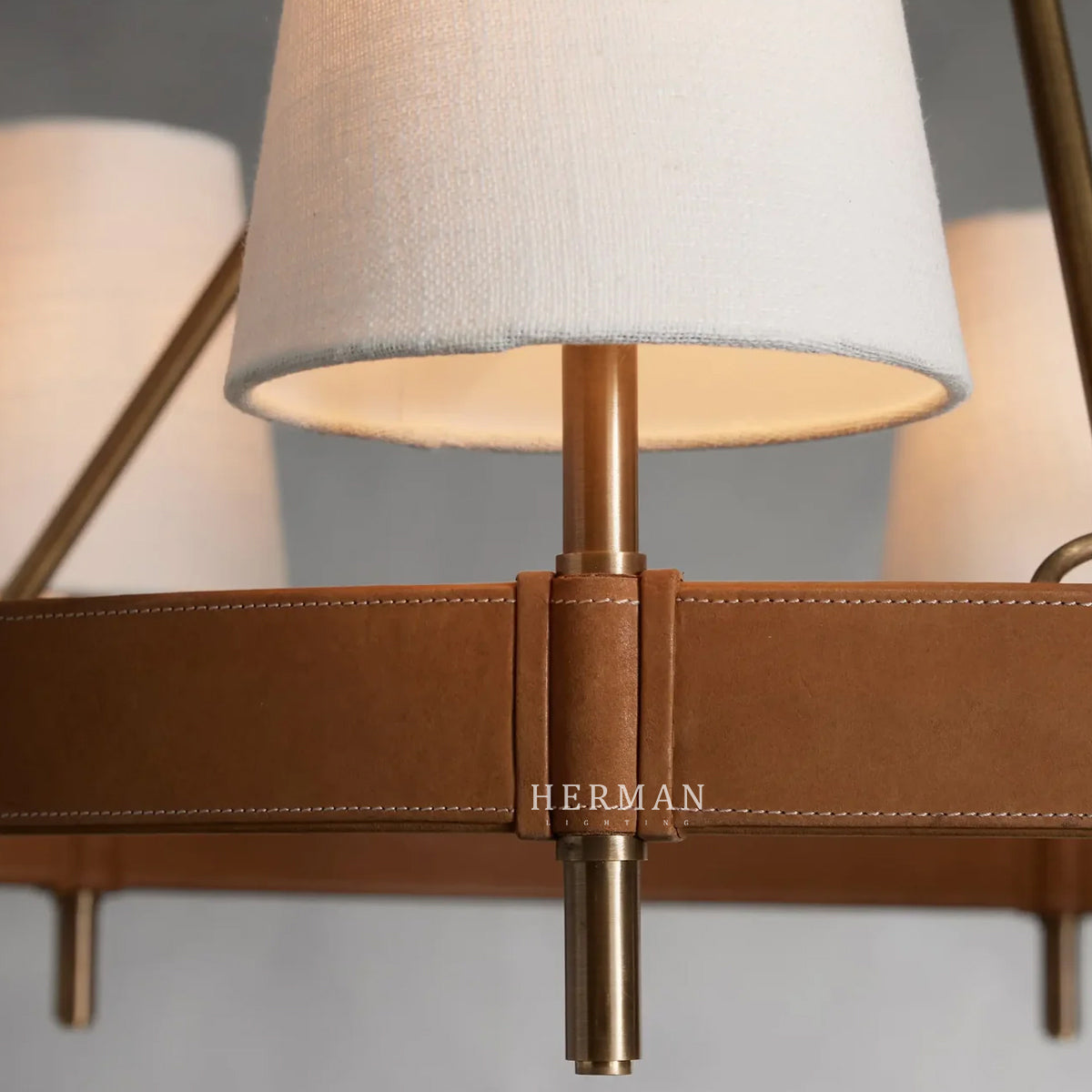 Iconic midcentury modern design and a juxtaposition of mixed materials inspire our Hastings Lighting Collection. Bases crafted from brass with an antiqued finish are complemented by tan leather stitched details and white linen shades to bring thoughtful elegance to any space.