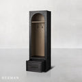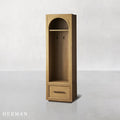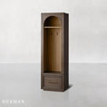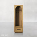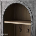 Made from solid oak wood and oak veneers, this piece showcases hand-applied finishes that enhance the wood's natural beauty. The interior features shiplap back paneling with contrasting finishes for a touch of elegance. Doors are detailed with exposed hinges and reeded hardware, antiqued for a timeless, vintage look. A sleek plinth base provides a sturdy foundation. Designed for versatility, it includes an adjustable or removable shelf, hanging hooks, and a convenient storage drawer.