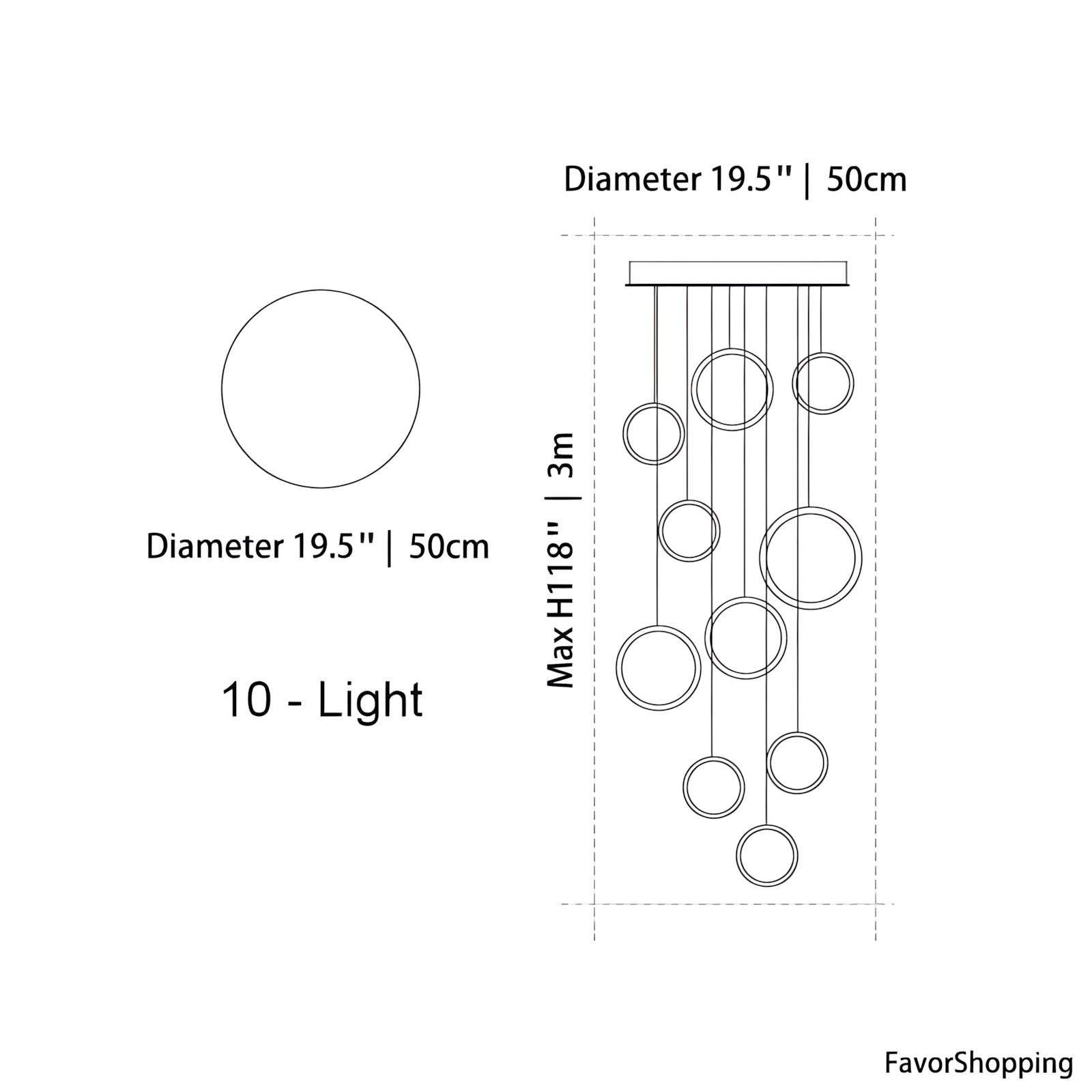 - 10 Lights: 15.7" / 40cm D x 118" / 300cm H