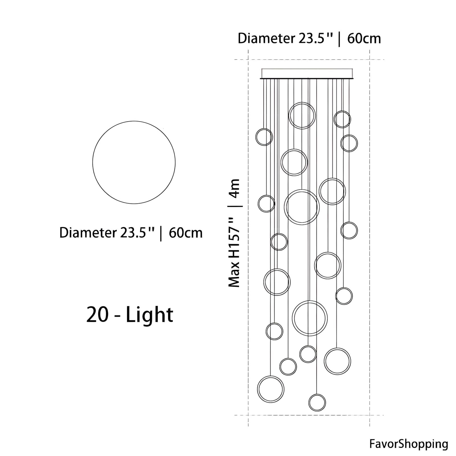 - 20 Lights: 23.5" / 60cm D x 157" / 400cm H