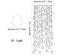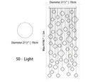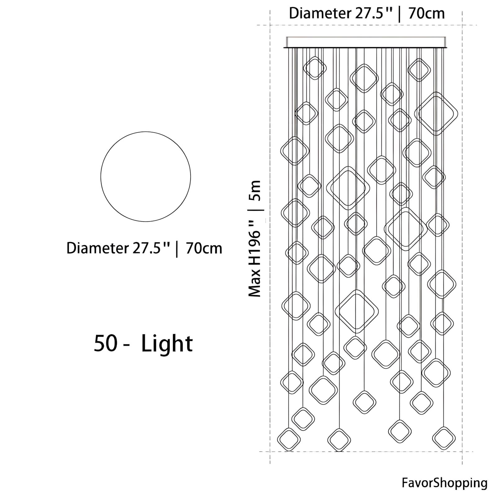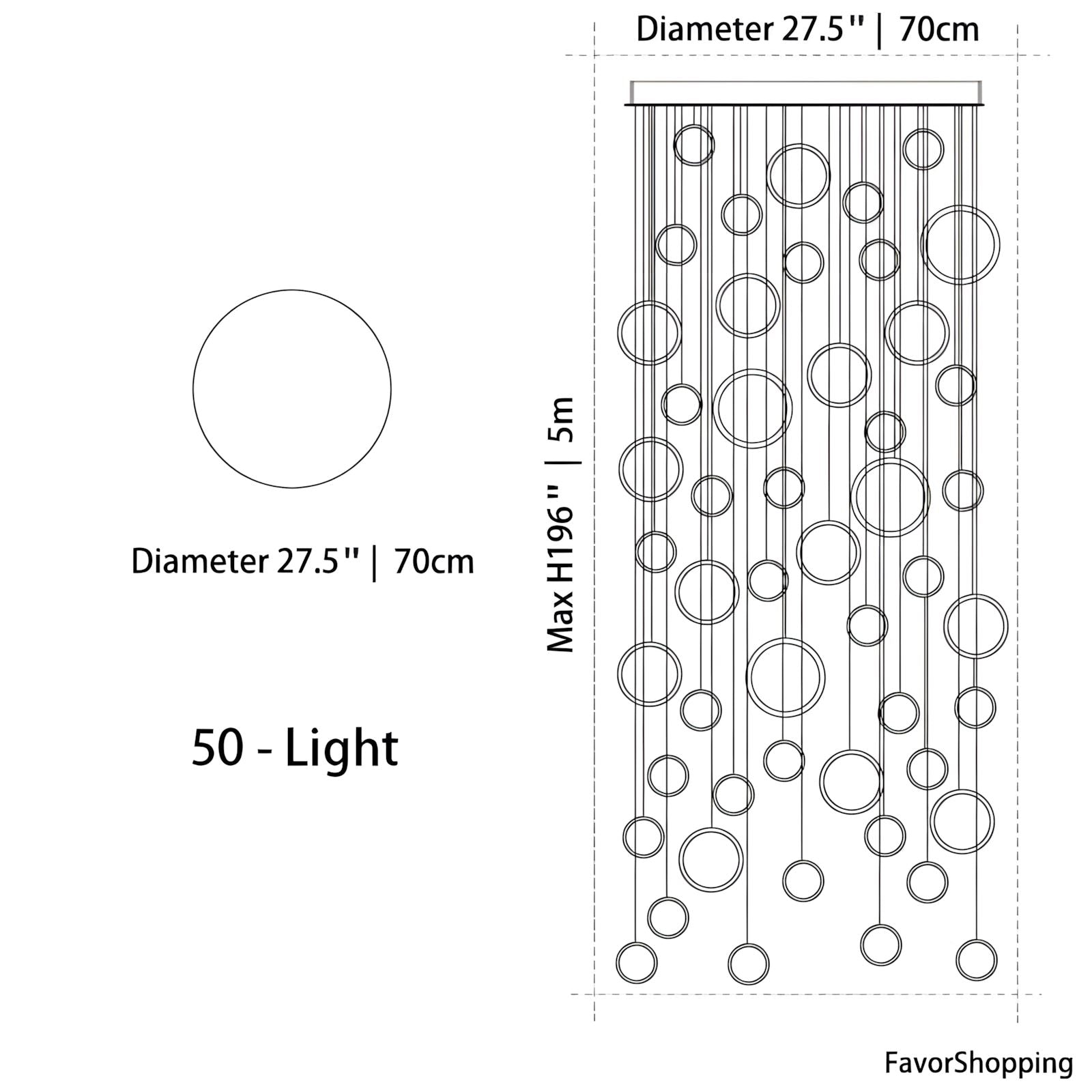 - 50 Lights: 27.5" / 70cm D x 196" / 500cm H