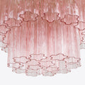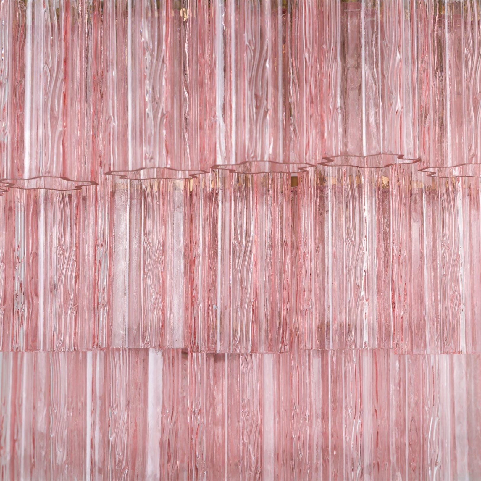 Four tiers of fluted glass tubes create this beautiful mid-century inspired chandelier. The textured glass tubes are individually hung from a Satin Brass frame. This style is available in three colours; a rich, sophisticated Smoked Quartz, a fresh blush Pink or clear glass.