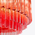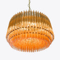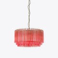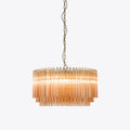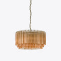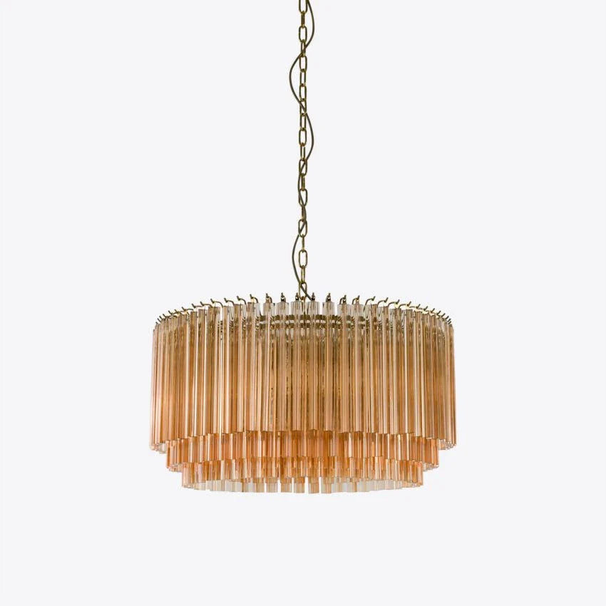 The Amaro chandeliers feature layers of mid-century inspired tri-style glass prisms, making them the ideal centerpiece for smaller spaces like living rooms, dining areas, or lobbies.