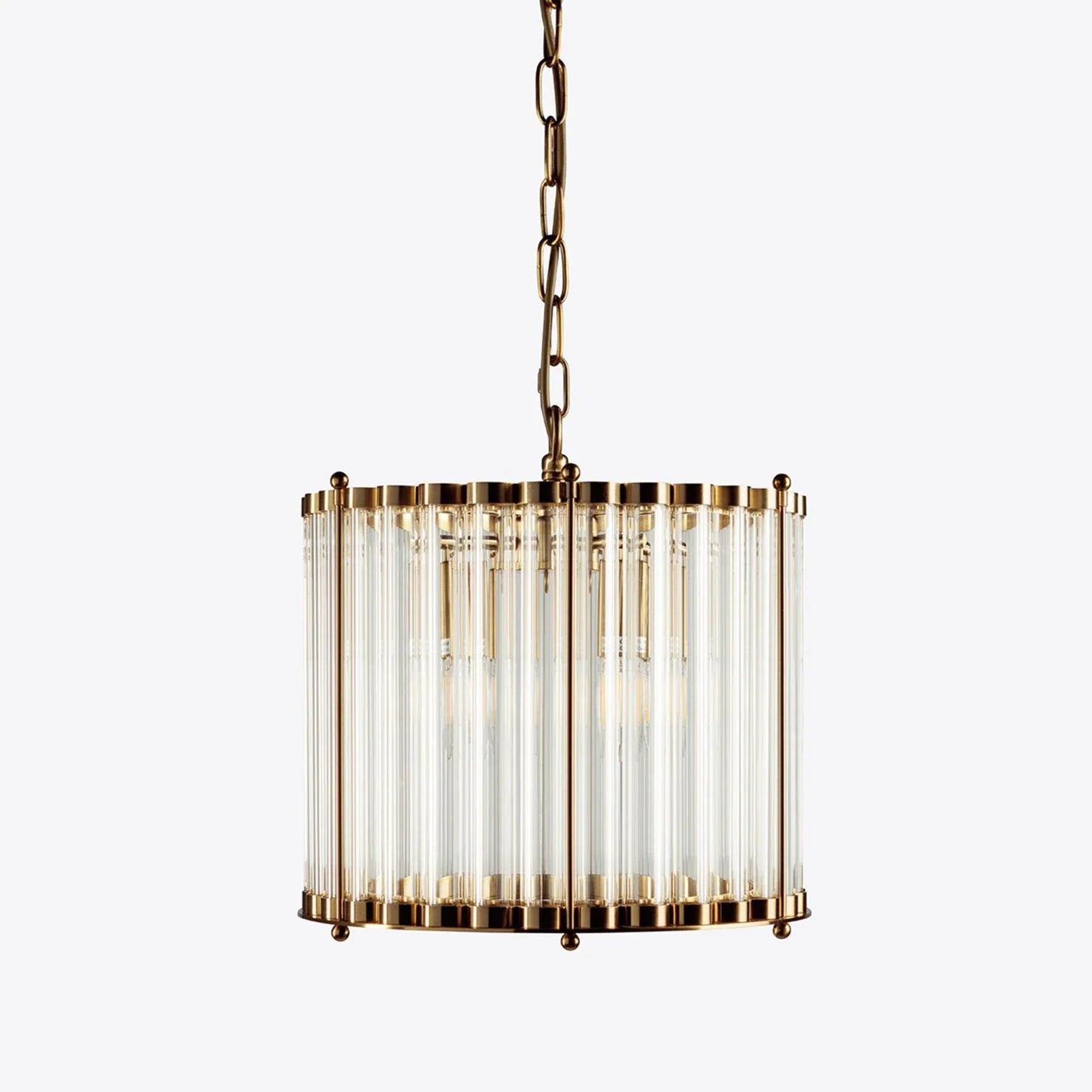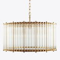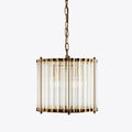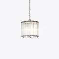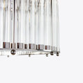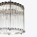 The elegant Monza drum chandelier showcases clear glass tubes housed within a sleek cylindrical nickel frame. Ideal for smaller spaces or arranged in clusters above a dining table, bar, or kitchen island.