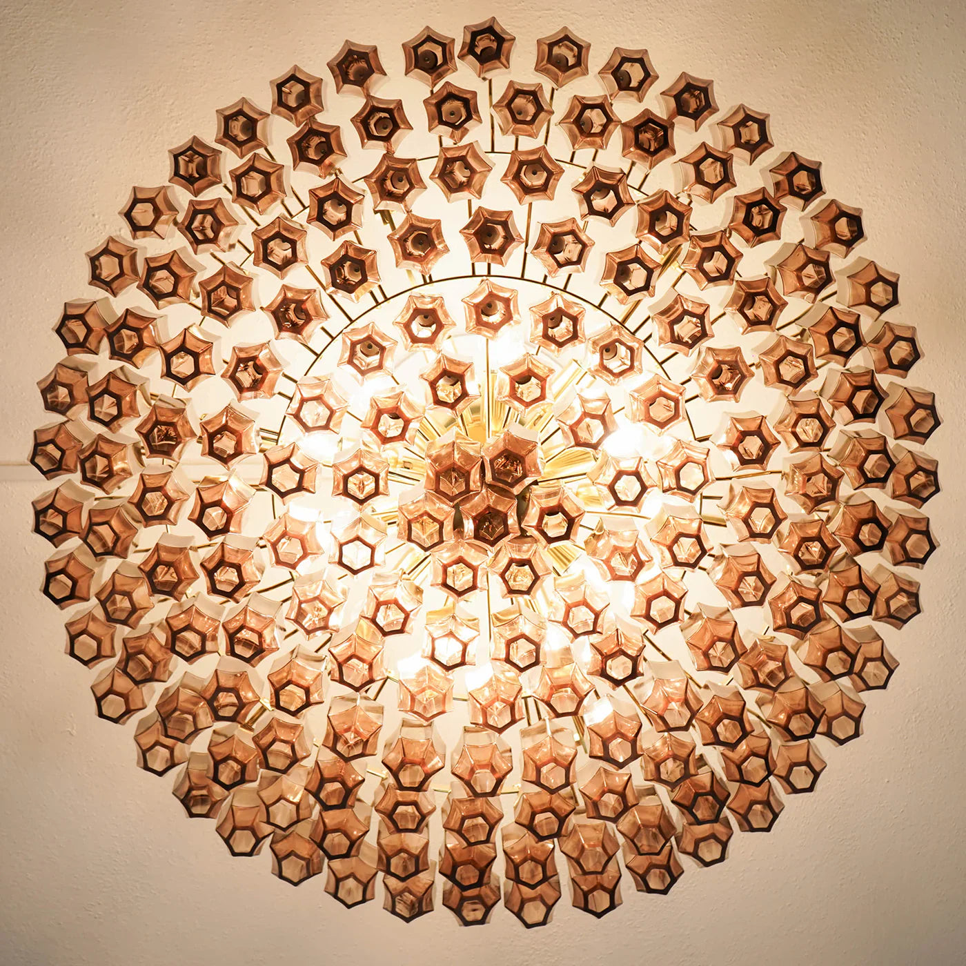 A splendid cluster of 169 mouth-blown amber glass elements shaped like pencils imbues this chandelier with a luxurious charm. Thanks to a special double magnifying lens design, each glass element contributes to the clever concealing of the brass hardware structure while offering a perfectly homogeneous and sophisticated light output.
