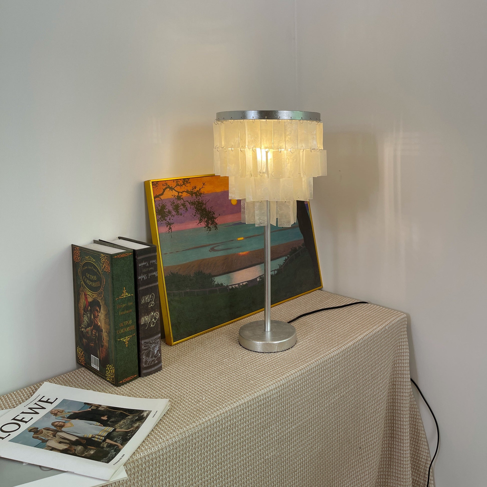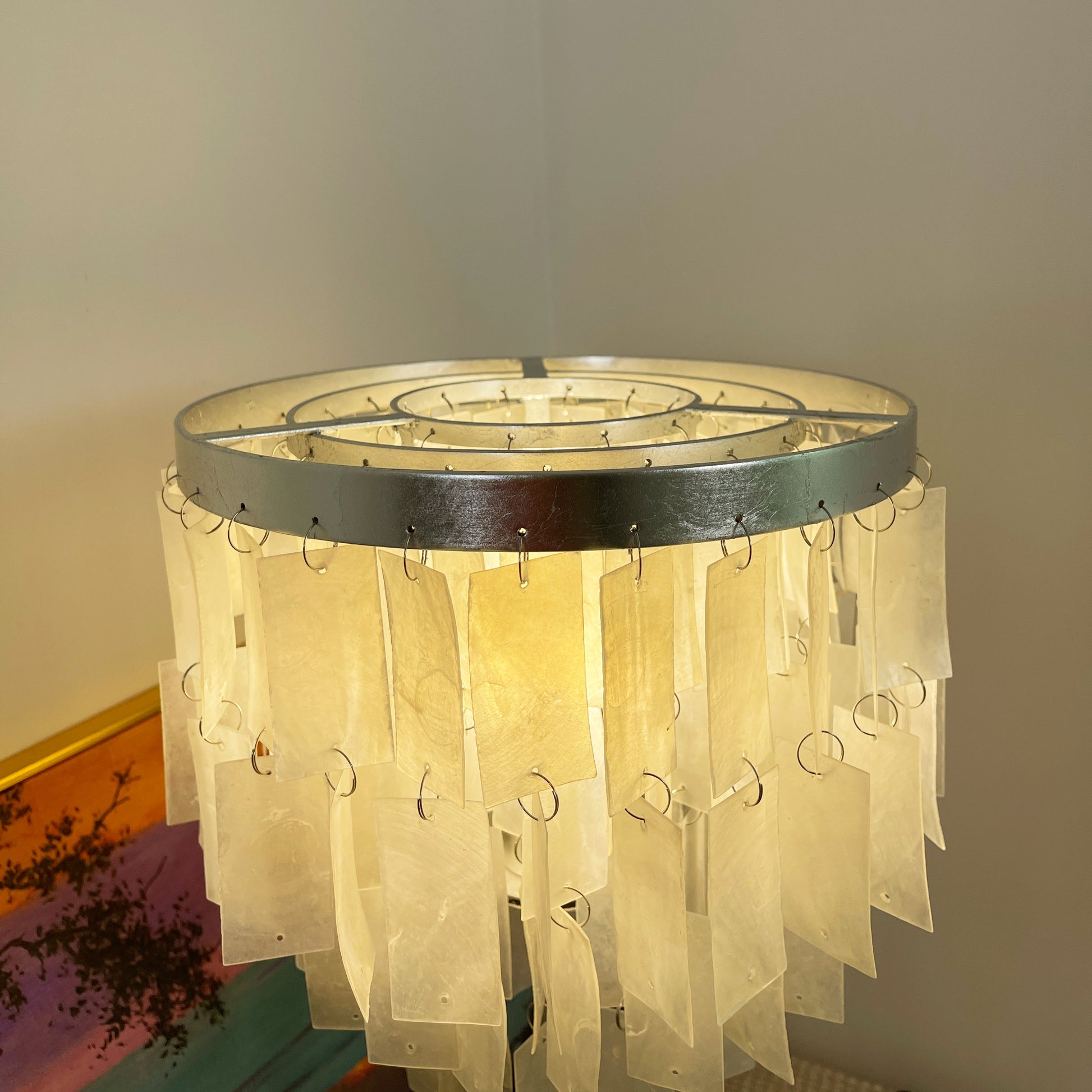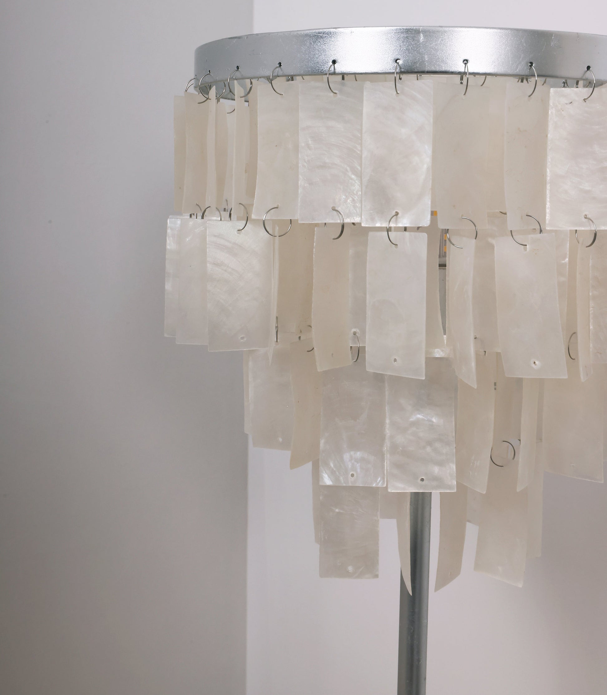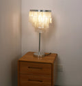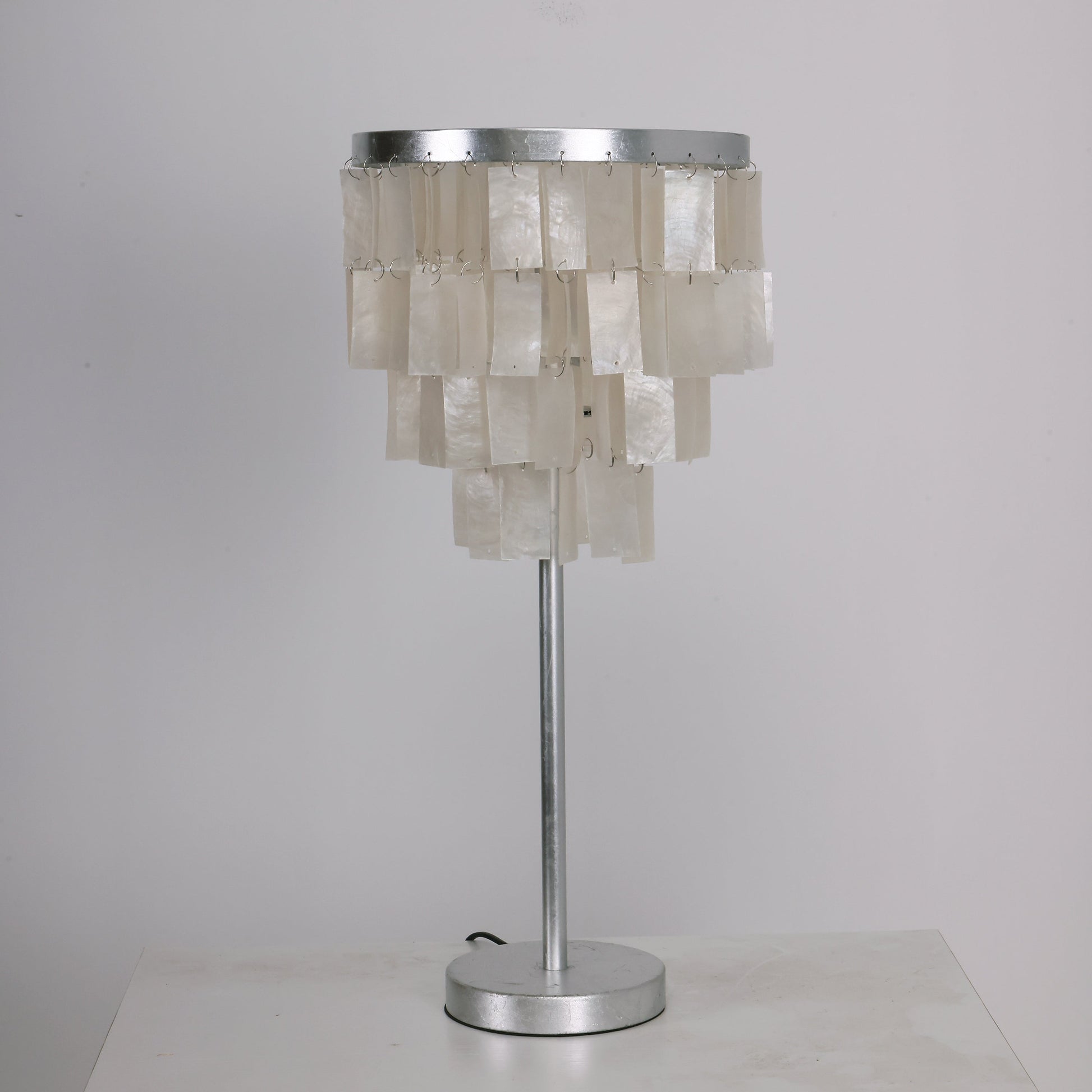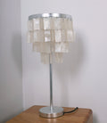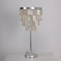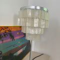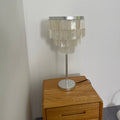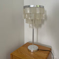 Skye Tiered Table Light, Rectangular shell tiles layered and hung. Our Vidirlighting table lamp showcases the stunning effect of seashells, projecting a pearly glow.
