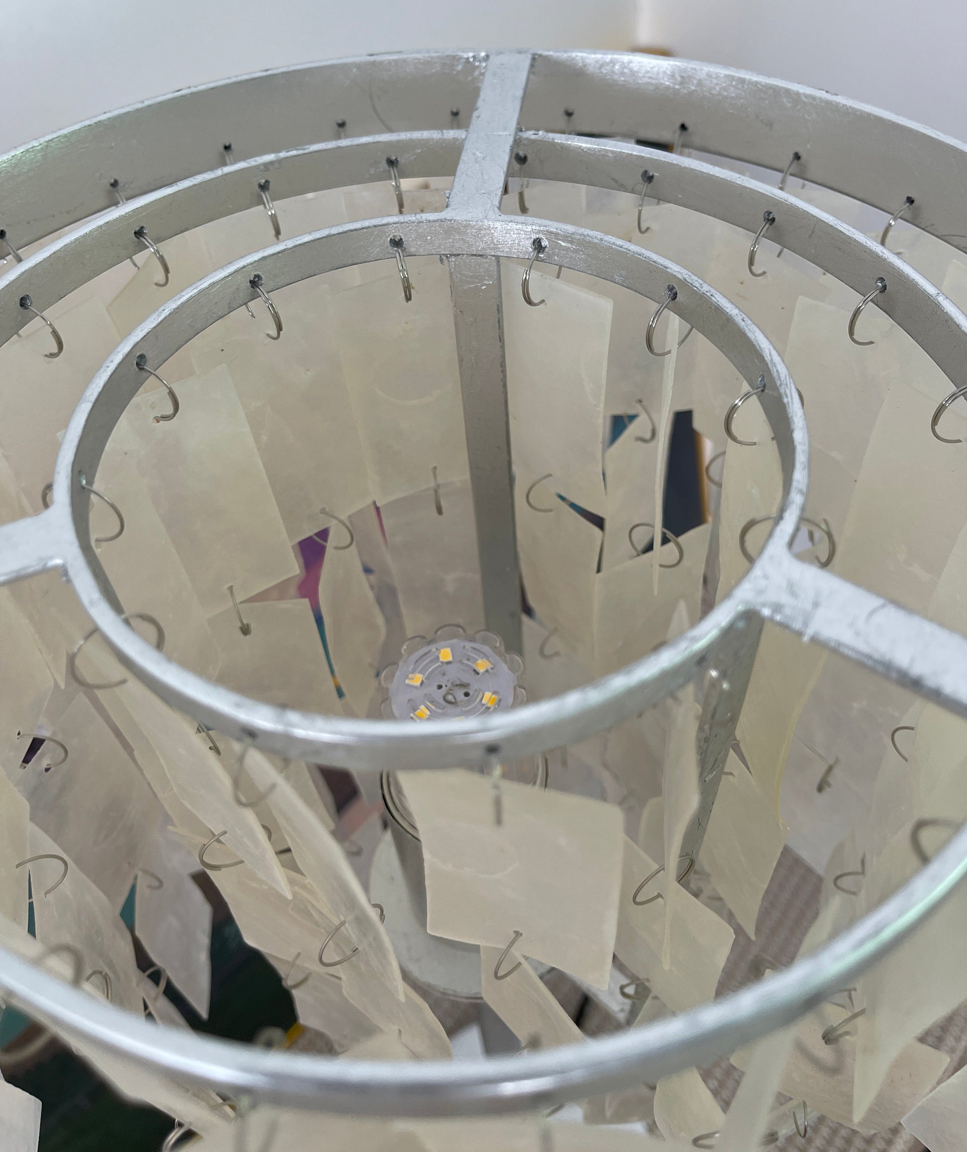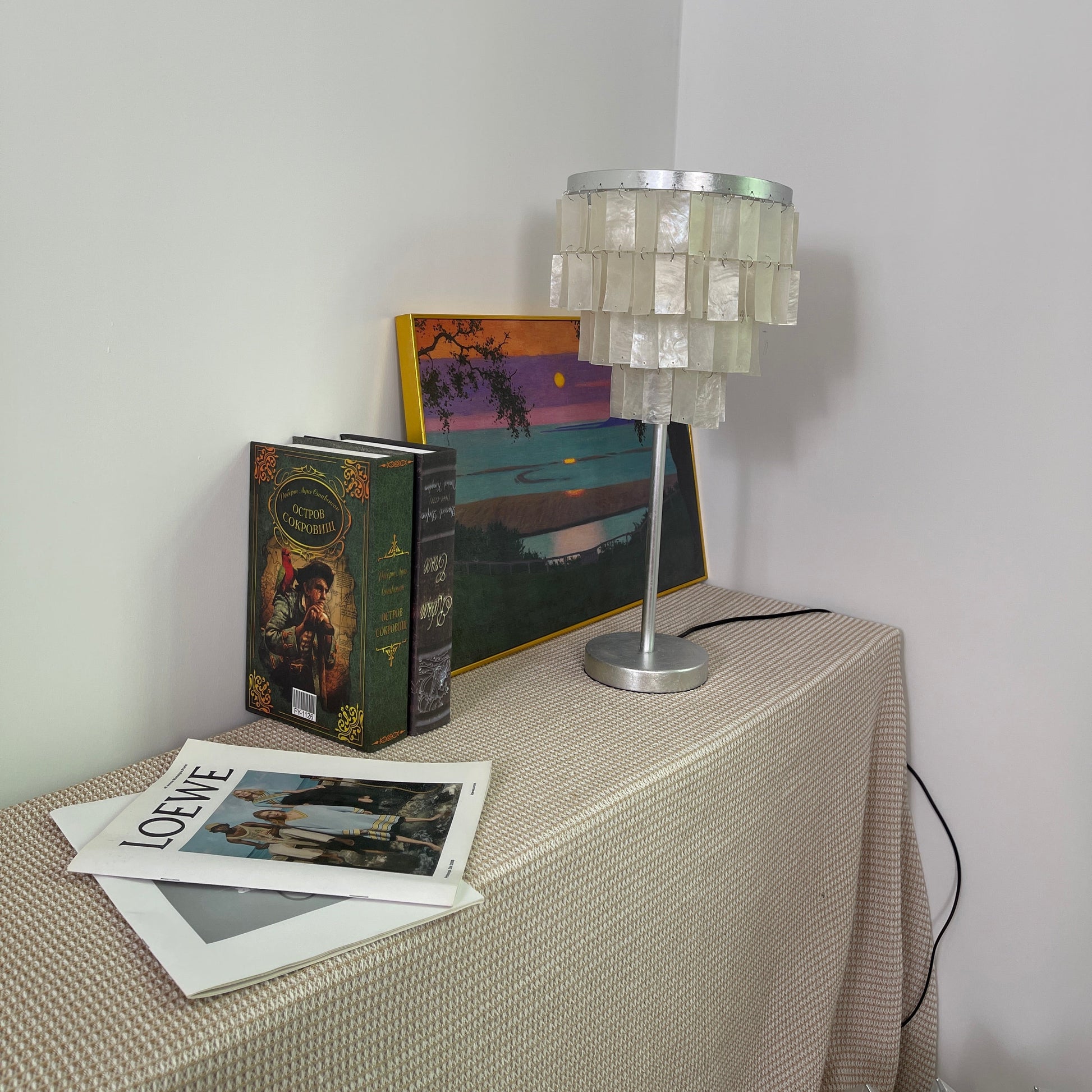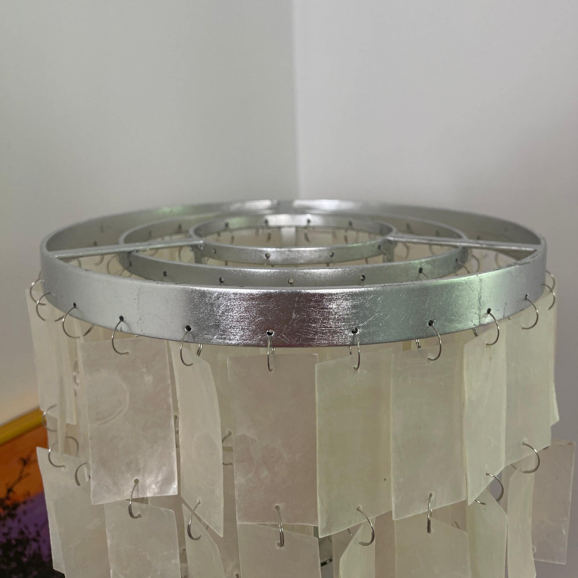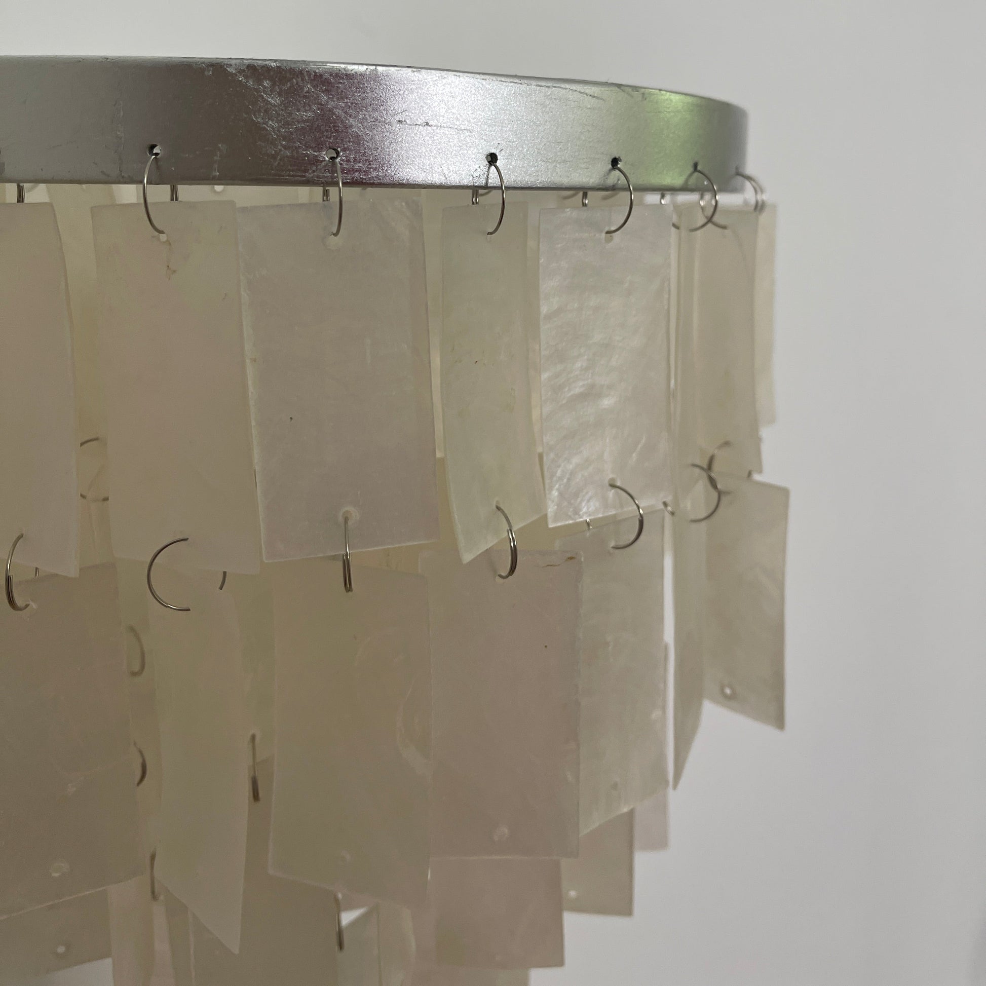 Skye Tiered Table Light, Rectangular shell tiles layered and hung. Our Vidirlighting table lamp showcases the stunning effect of seashells, projecting a pearly glow.