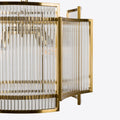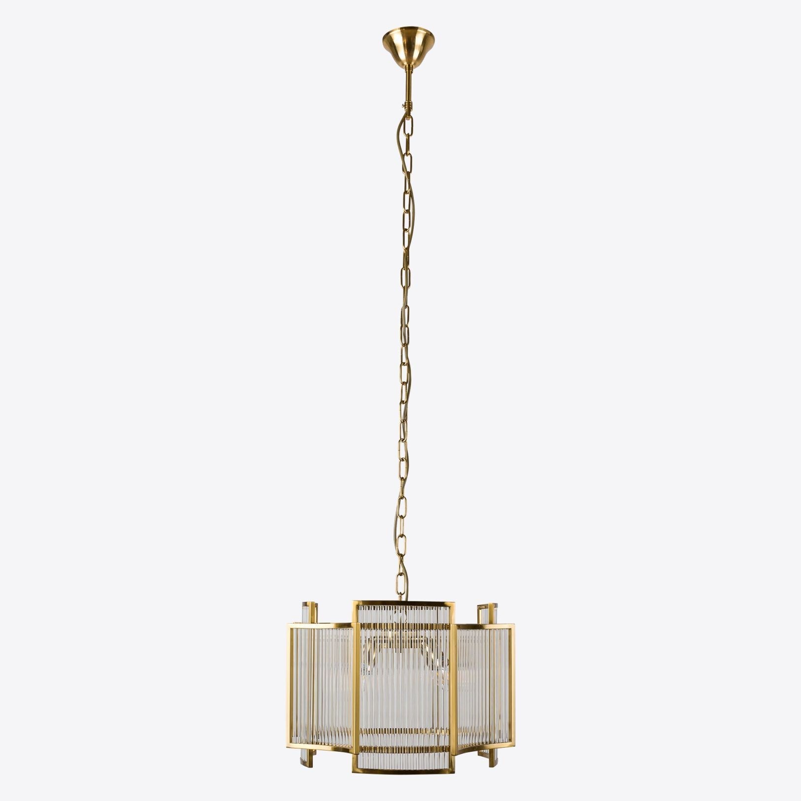 The large Monte Carlo chandelier features brass finished metalwork, enclosing clear glass rods to create a timeless look suitable for contemporary and traditional interior schemes. The perfect addition to a living or dining room.