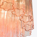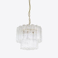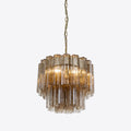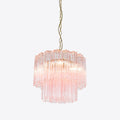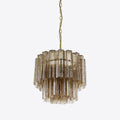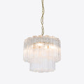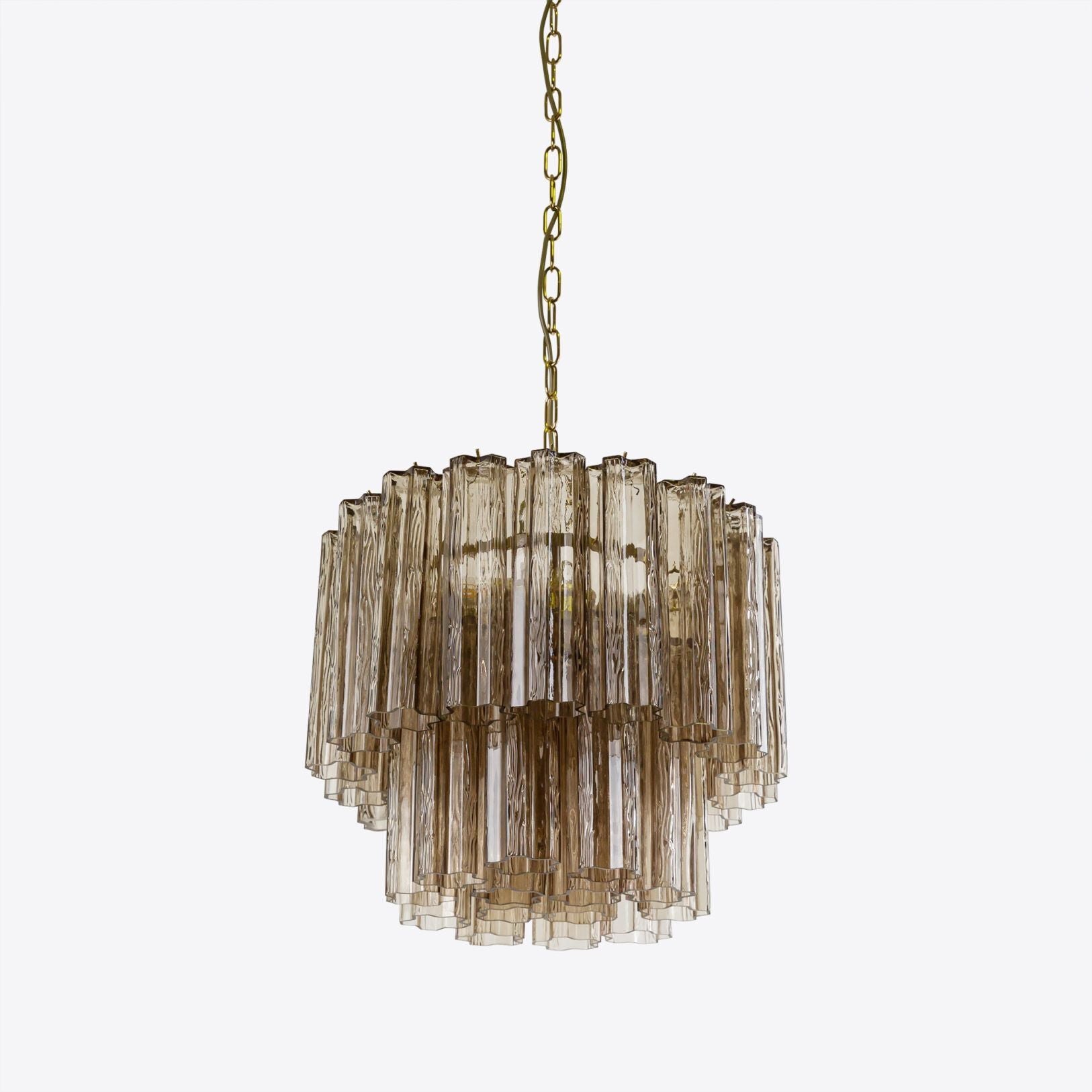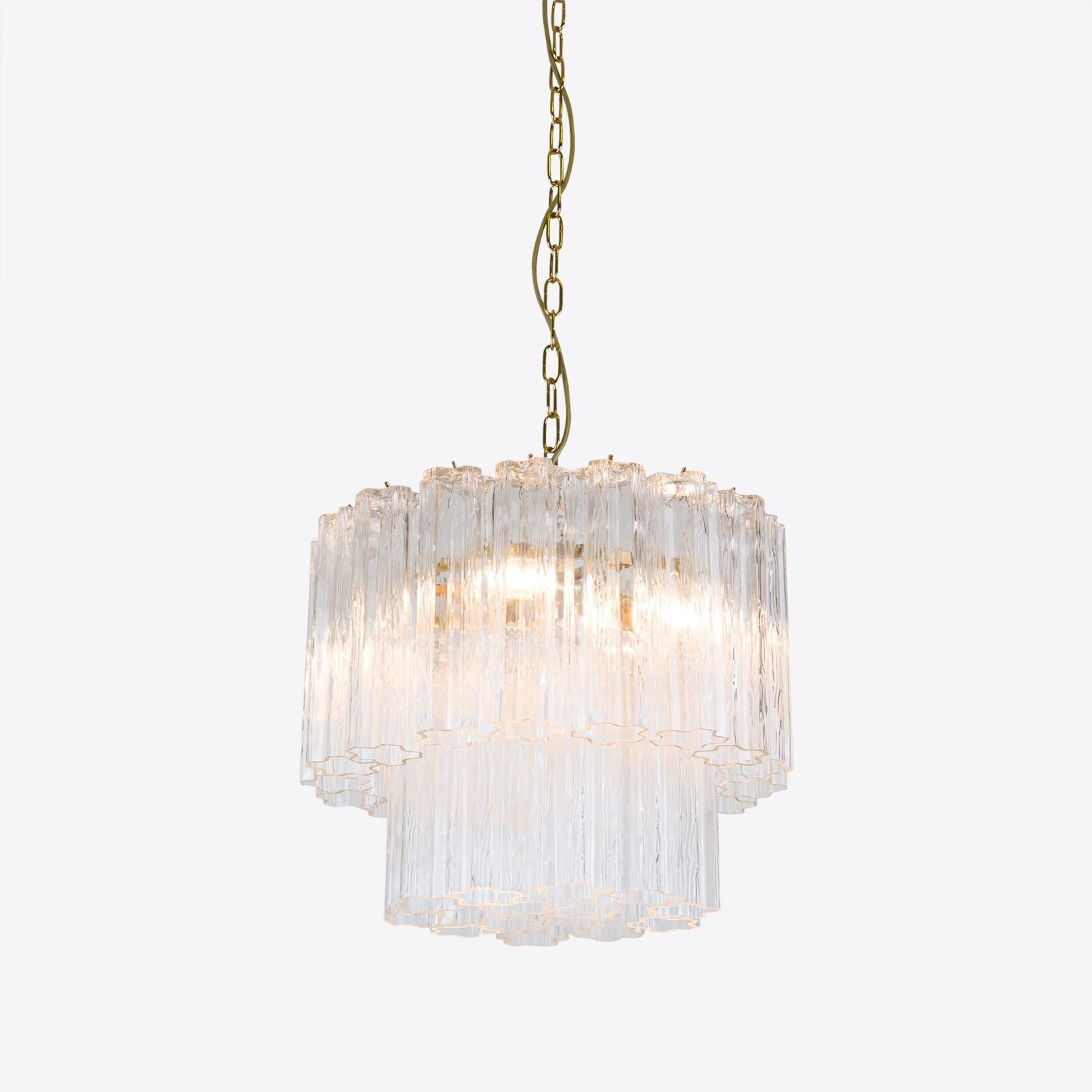 Two tiers of fluted glass tubes create this small but perfectly formed mid-century inspired chandelier. The textured glass tubes are individually hung from a Satin Brass frame. This style is available in three colours; a rich, sophisticated Smoked Quartz, a fresh blush Pink or clear glass.