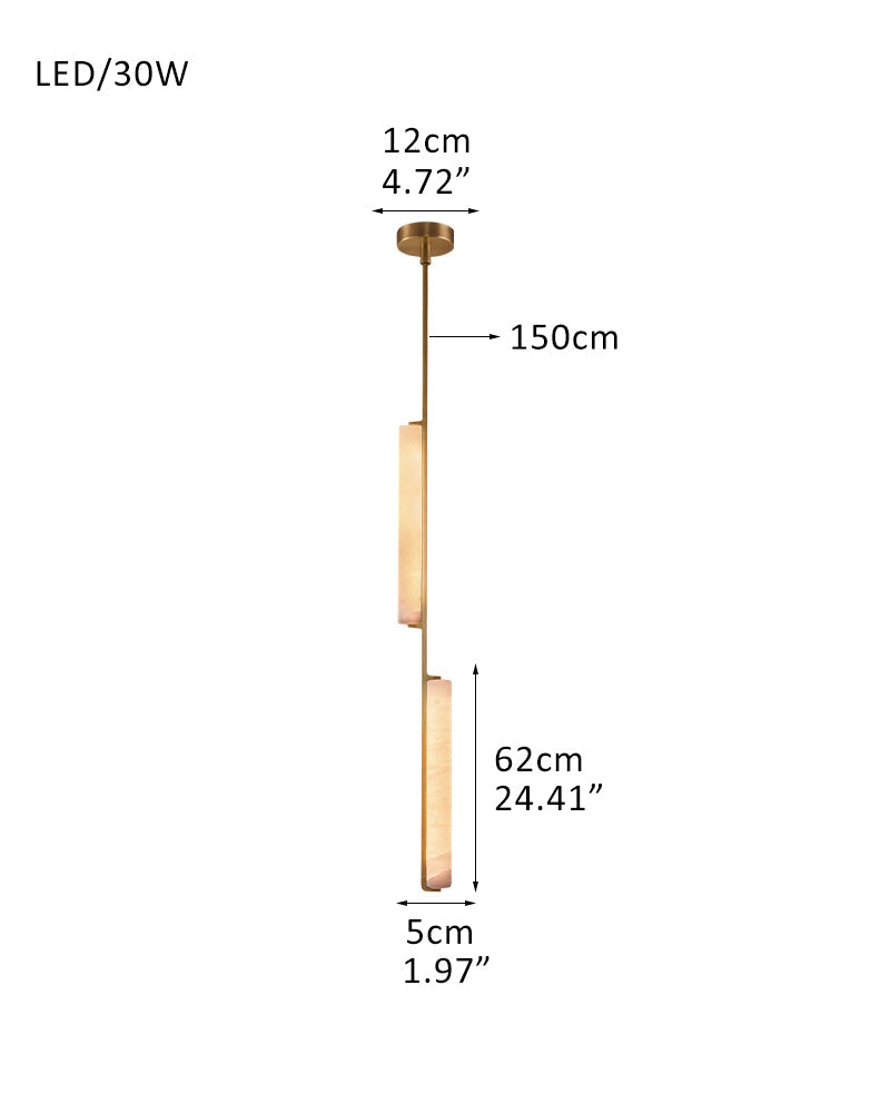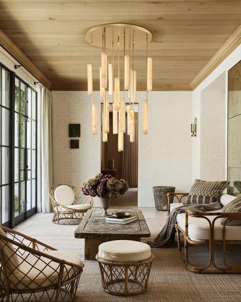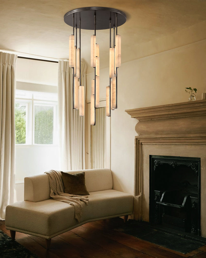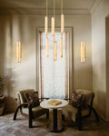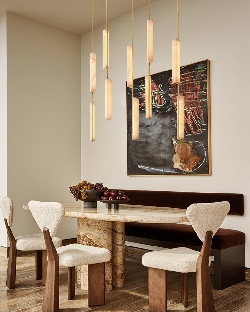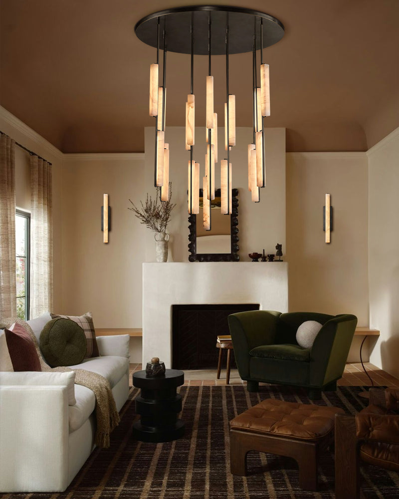 A sculptural ode to 1960s Italy: Two alabaster prisms suspended from brass rods emit candlelit warmth via concealed LEDs, transforming ceilings into ethereal landscapes.