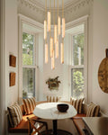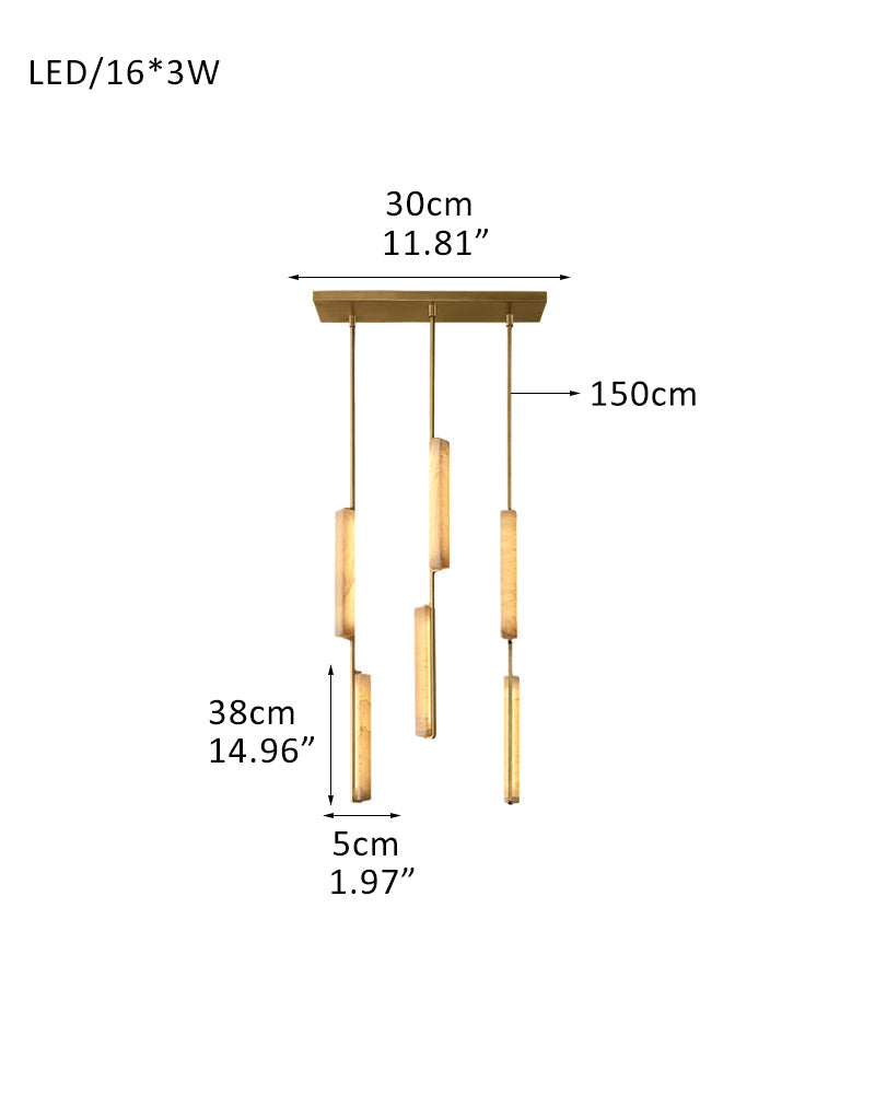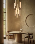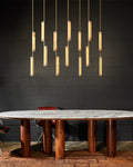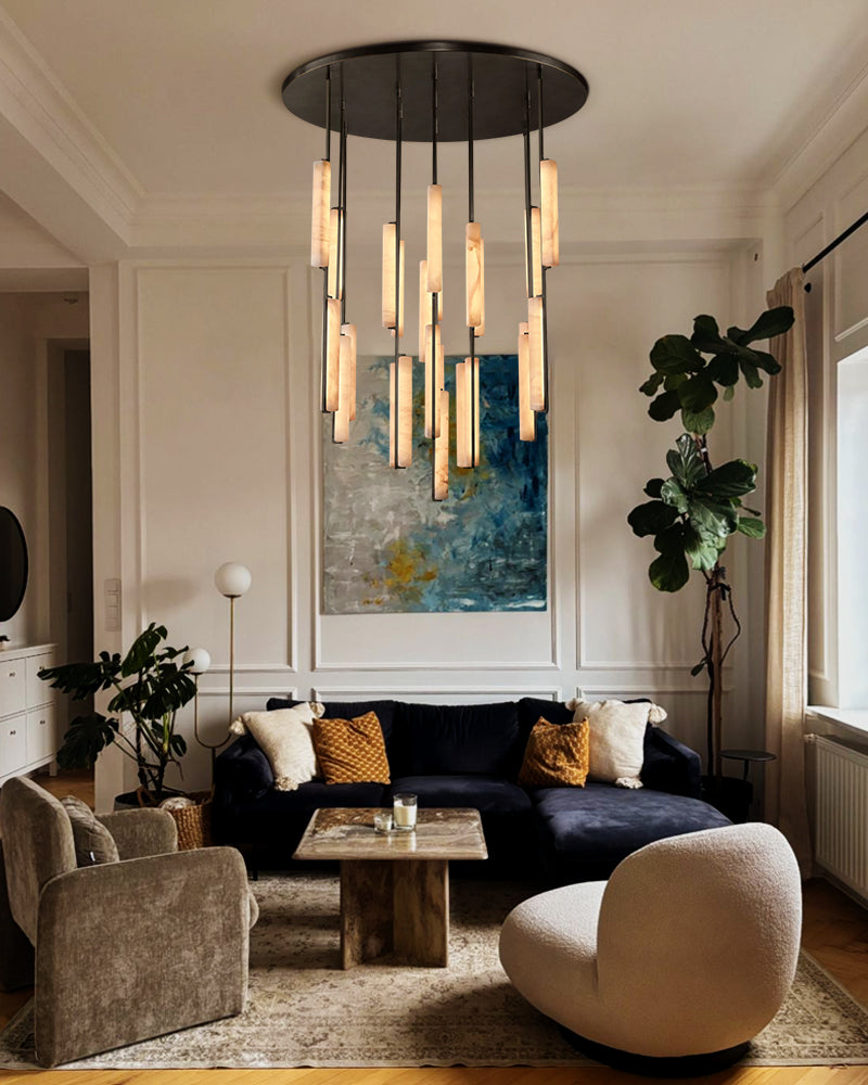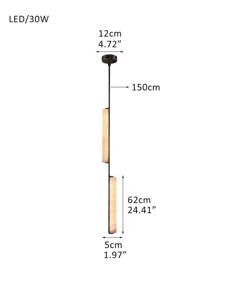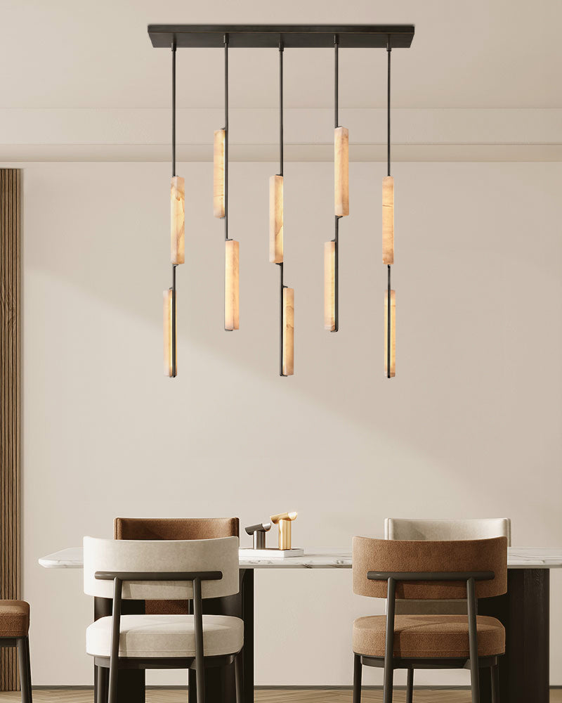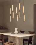 A sculptural ode to 1960s Italy: Two alabaster prisms suspended from brass rods emit candlelit warmth via concealed LEDs, transforming ceilings into ethereal landscapes.